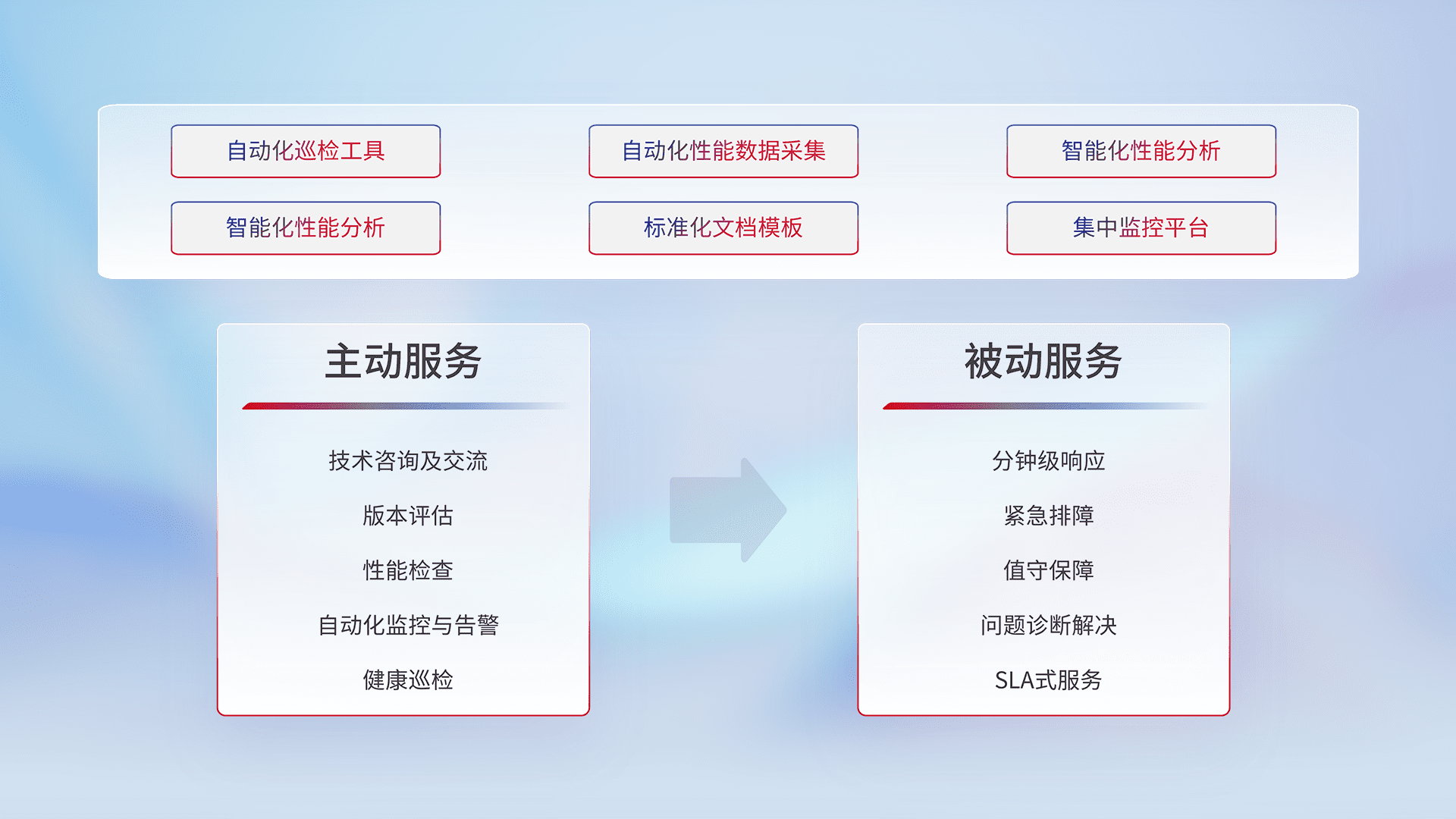 智能化工具和标准化文档,,,保障服务质量,,,提供主动服务(包含技术咨询、、版本评估、、、、性能检查、、、、自动化监控与告警、、健康巡检)和被动服务包含(分钟级响应、、紧急排障、、值守保障、、、问题诊断解决、、、SLA服务)。。。