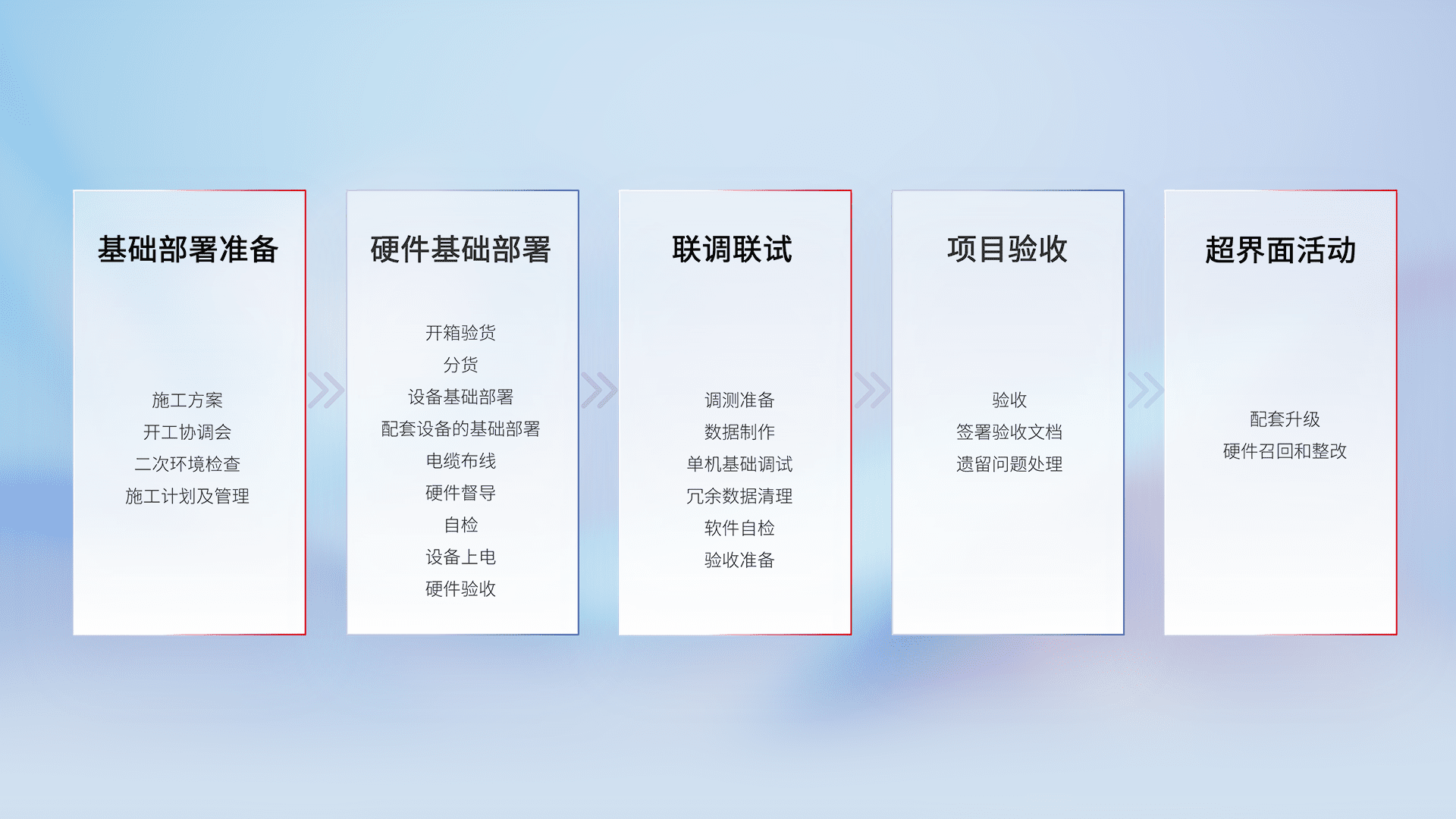 从基础部署准备、、硬件基础部署、、、联调联试、、项目验收、、、、越界面活动的全过程可追溯,,,,保证施工质量和进度。。。